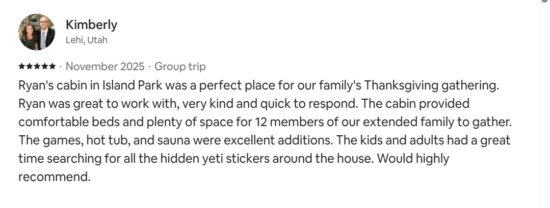 Less than 45 minutes from Yellowstone National Park, Mesa Falls, Harriman State Park, Island Park Reservoir, and more! This forest getaway is a great home-base for all of your outdoor adventures! Whether you are adventuring, or looking for a relaxing home away from home, we've got space for you.